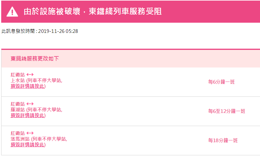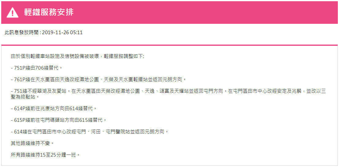 據(jù)港鐵消息,11月26日,香港地鐵各線(機(jī)場快線除外)、輕鐵及港鐵巴士的服務(wù)將于晚上11:30時(shí)結(jié)束。大學(xué)站繼續(xù)關(guān)閉,列車不停大學(xué)站。個(gè)別車站出入口也會(huì)暫時(shí)關(guān)閉。