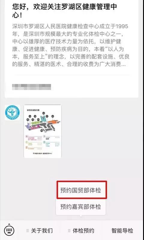 首先,關(guān)注公眾號“羅湖醫(yī)院集團(tuán)健康管理中心”,進(jìn)入公眾號點擊菜單欄“預(yù)約國貿(mào)部體檢”。