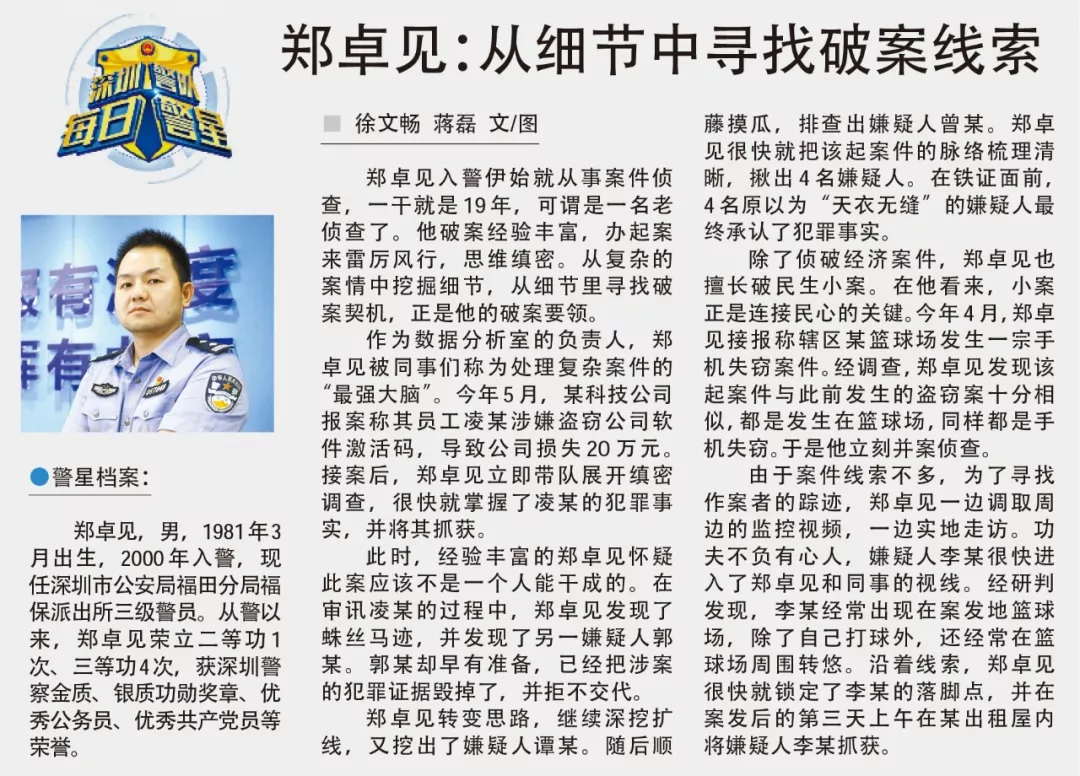 鄭卓見(jiàn),男,1981年3月出生,2000年入警,現(xiàn)任深圳市公安局福田分局福保派出所三級(jí)警員。從警以來(lái),鄭卓見(jiàn)榮立二等功1次、三等功4次,獲深圳警察金質(zhì)、銀質(zhì)功勛獎(jiǎng)?wù)?、?yōu)秀公務(wù)員、優(yōu)秀共產(chǎn)黨員等榮譽(yù)。