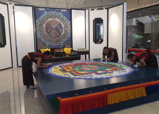 在活動(dòng)現(xiàn)場(chǎng),壇城沙畫(huà)的現(xiàn)場(chǎng)制作格外引人注目?!耙簧骋皇澜纾蝗~一菩提”——壇城沙畫(huà)的過(guò)程仿佛一場(chǎng)視覺(jué)的盛宴。據(jù)了解,壇城是指對(duì)一座宮殿一個(gè)世界的泛義,用珍貴珊瑚、瑪瑙、綠松石等礦物質(zhì)研磨成粉,落沙即成畫(huà),畫(huà)面立體生動(dòng),壇城展示了高度的藝術(shù)魅力和視覺(jué)觀感。