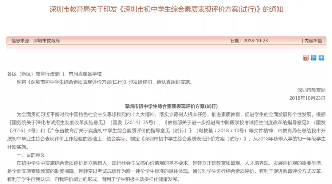 ▲深圳市教育局此前發(fā)布的《深圳市初中學(xué)生綜合素質(zhì)表現(xiàn)評(píng)價(jià)方案(試行)》