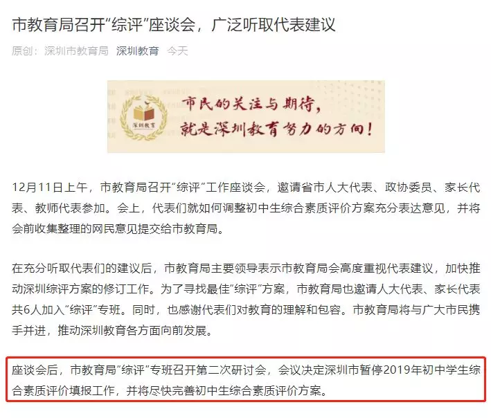座談會后,市教育局“綜評”專班召開第二次研討會,會議決定深圳市暫停2019年初中學生綜合素質評價填報工作,并將盡快完善初中生綜合素質評價方案。