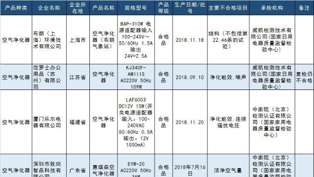 11批次不合格空氣凈化器產(chǎn)品名單