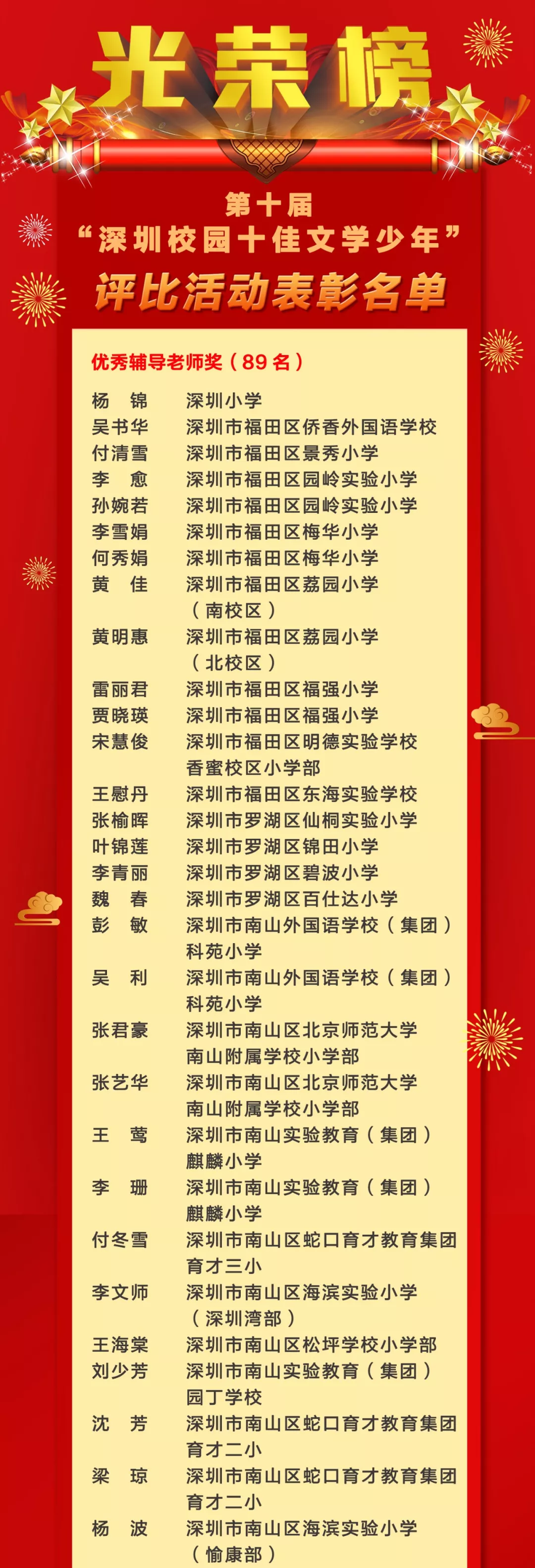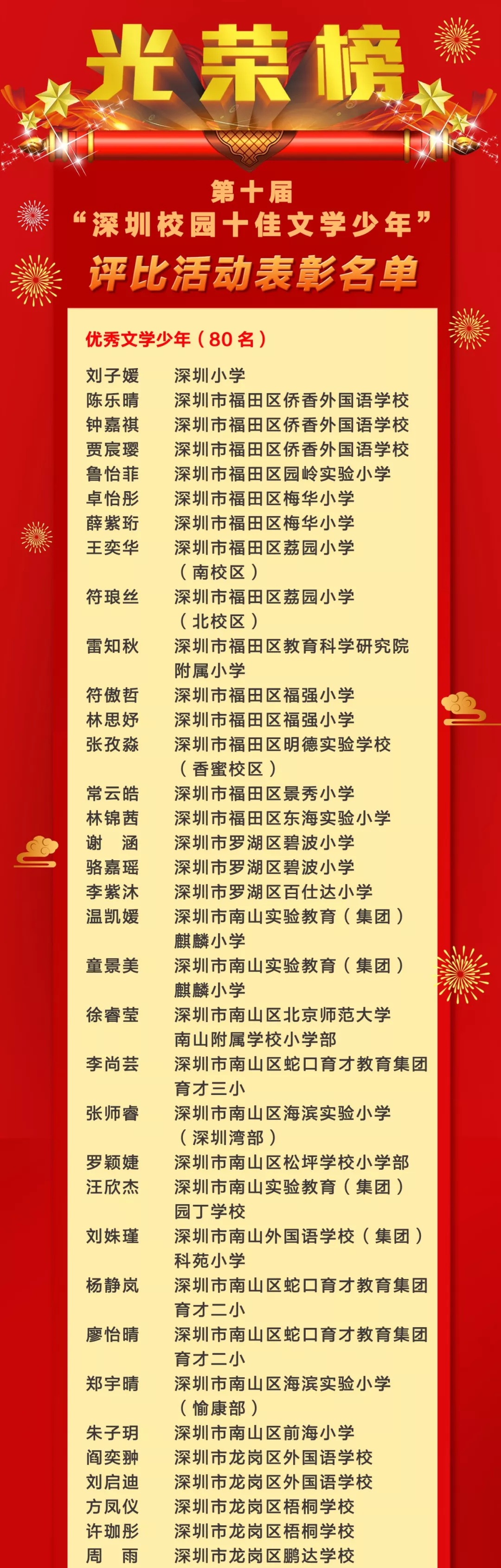 第十屆“深圳校園十佳文學少年”評比活動表彰名單