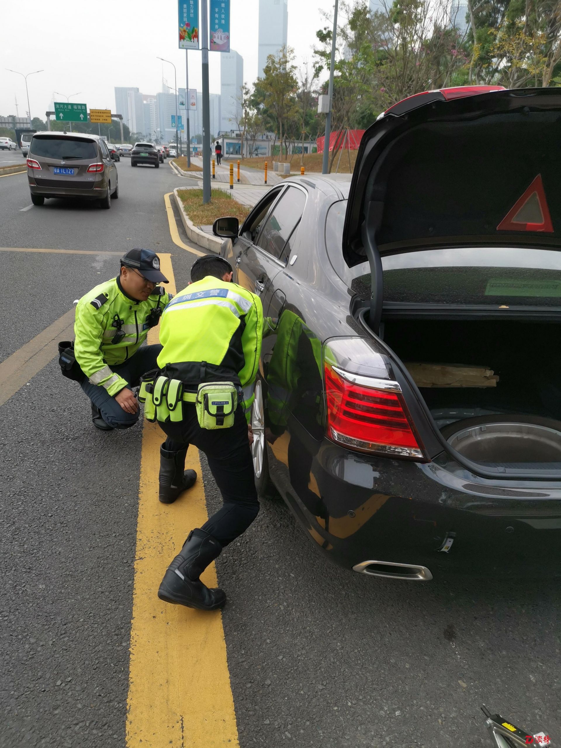 正當記者心急如焚且束手無策之時,在路上巡查的福田交通大隊香蜜湖中隊鐵騎鄭彬銳警官途經此地,見狀他立即停住鐵騎,上前詢問情況。當他看到車輛左側兩輪均癟下時,立即問記者是否有備胎,同時讓記者趕緊聯(lián)系車行再送一個備胎過來。