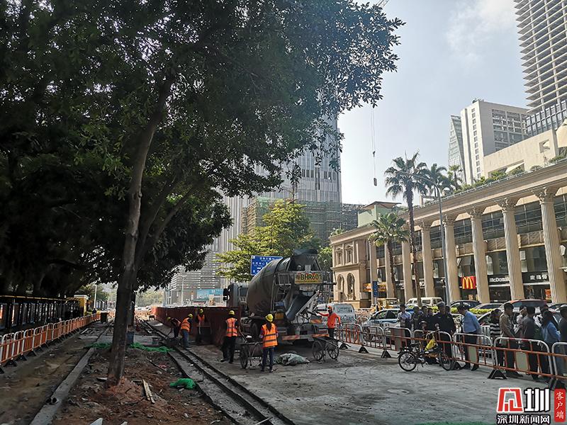 福田區(qū)福中三路和民田路的施工現(xiàn)場,道路被挖,一輛挖掘機停在道路上。