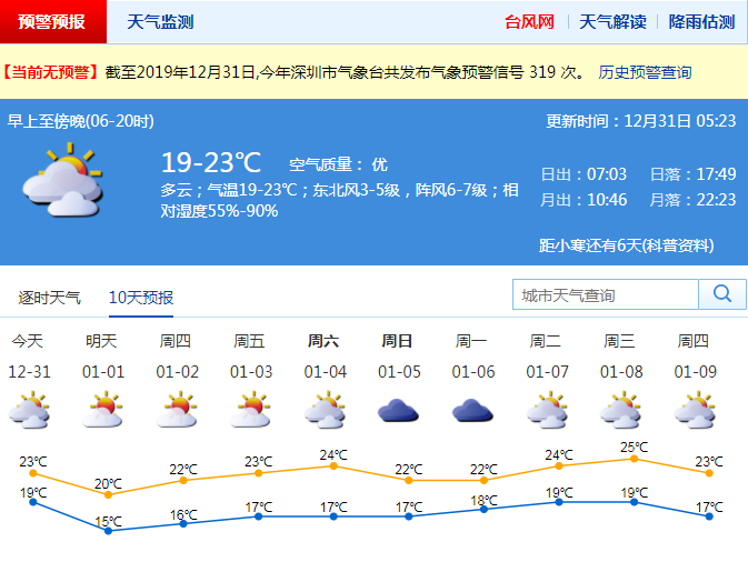 (二)春節(jié)期間(1月24-30日),深圳多云為主,假期中后期有弱冷空氣影響,氣溫略降,最低氣溫13-15℃左右。