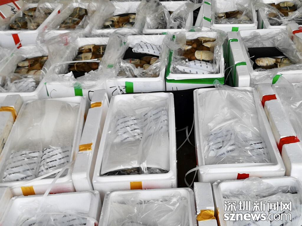 當(dāng)日上午,關(guān)員在一輛兩地牌貨車(chē)中發(fā)現(xiàn)大量未經(jīng)申報(bào)的象拔蚌,共計(jì)43箱。據(jù)該批象拔蚌外包裝標(biāo)記顯示,產(chǎn)地為美國(guó)。