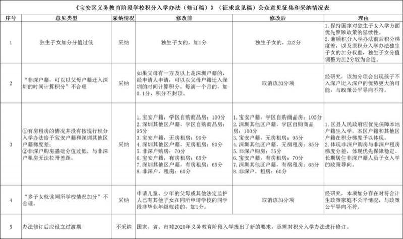 晶報(bào)2020年01月06日訊 獨(dú)生子女加分?jǐn)M由1分調(diào)整至2分,多子女就讀同所學(xué)校加分取消。日前,《寶安區(qū)義務(wù)教育階段學(xué)校積分入學(xué)辦法(修訂稿)》(征求意見稿)經(jīng)論證修改后再度公示。去年12月,寶安區(qū)教育局發(fā)布相關(guān)公告,擬對積分入學(xué)錄取方式和積分方式進(jìn)行修訂,其中,"獨(dú)生子女加分從90分調(diào)整至1分"引發(fā)廣泛關(guān)注。在新修訂稿中,寶安區(qū)教育局結(jié)合市民意見反饋,擬將獨(dú)生子女加分由1分調(diào)整至2分,并取消兩項(xiàng)加分項(xiàng),同時(shí)對部分情況分值進(jìn)行調(diào)整,以體現(xiàn)積分梯度。