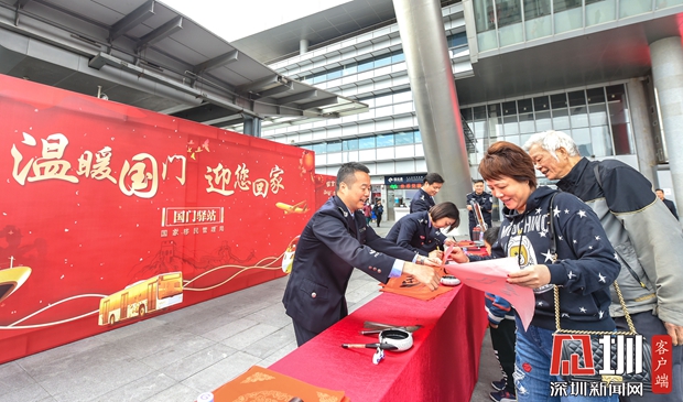 皇崗邊檢站民警用熱情的中國紅營造濃郁的“年味兒”,以親切的問候帶給返鄉(xiāng)過年的旅客回家的溫暖,現場有不少在外務工人員、港澳臺同胞、外籍旅客寫下“國泰民安”的美好心愿,與民警們一同揮毫潑墨,迎春送福。