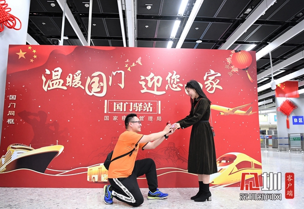 1月20日,西九龍邊檢站“國門驛站”展板前,在邊檢民警的掌聲和祝福中,旅客官先生鄭重向女友宋女士求婚,有情人終成眷屬,“在國門求婚,把愛人帶回家門”成為一段佳話。為營造溫馨喜慶的春節(jié)氛圍,該站在口岸設置主題活動展板,懸掛節(jié)日裝飾,還研發(fā)小程序,在驗證臺一體機向旅客展示主題海報,令人耳目一新。