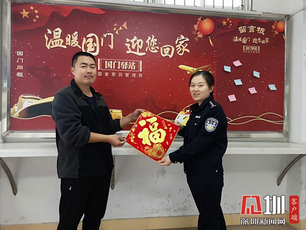沙頭角邊檢站特別拍攝春節(jié)宣傳片,在口岸多個場地播放,營造“年”的氛圍,為出入境旅客送上小燈籠、“福”字等小禮品,與旅客在執(zhí)勤現場合影,并當場打印出照片贈與留念,讓每一位歸家的游子第一時間感受到祖國的溫暖和春節(jié)的幸福。
