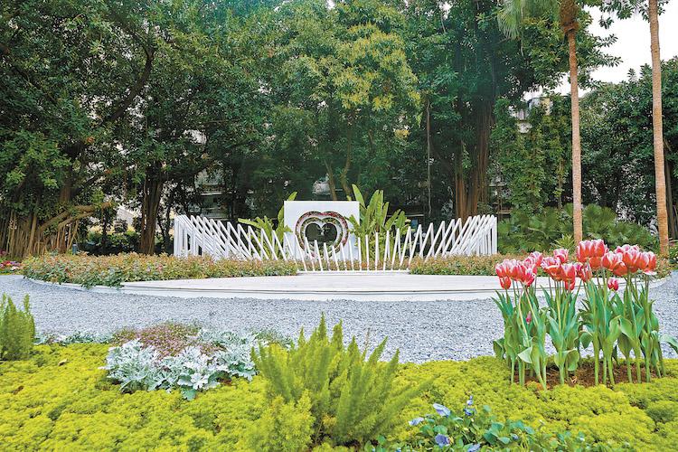 ▲玫瑰之約月季主題花園布置了心形創(chuàng)意花臺。