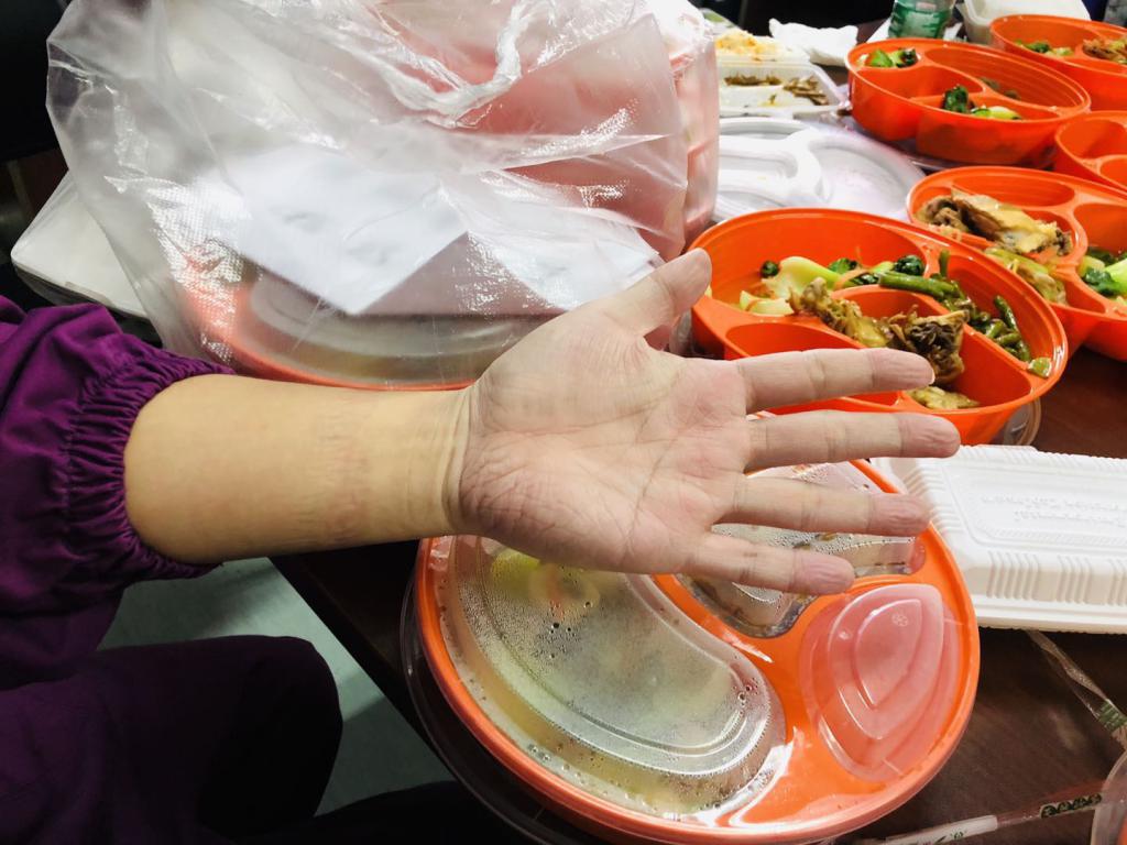 ▲大年三十下午2時(shí)左右,深圳市第三人民醫(yī)院感染 ICU病房的護(hù)士剛吃上飯。他穿著防護(hù)服、戴著口罩,悶得透不過氣來,渾身都是汗。手被泡得起了皺,臉上依然還有口罩壓著的痕跡。
