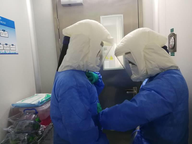 ▲大年三十,深圳市第三人民醫(yī)院實(shí)驗(yàn)室正在進(jìn)行確診患者的病毒載量動(dòng)態(tài)檢測(cè),他們?cè)诓僮鞯臅r(shí)候穿著重達(dá)3至4斤的個(gè)人防護(hù)裝備,進(jìn)去一次就連續(xù)工作4個(gè)小時(shí)左右,每次出來內(nèi)衣全部濕透。