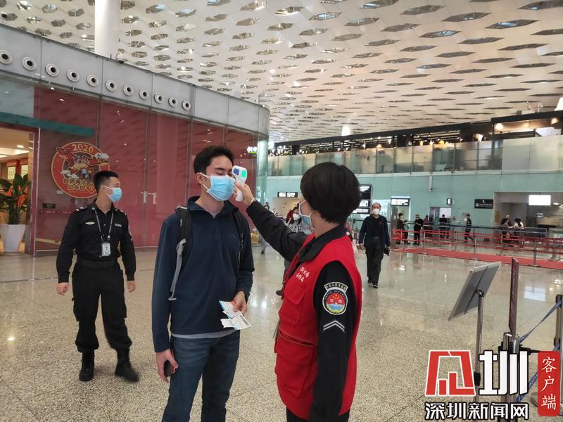 在深圳機(jī)場(chǎng),工作人員對(duì)往來(lái)乘客進(jìn)行體溫檢測(cè)。