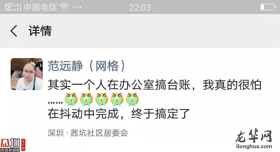 龍華區(qū)福城街道茜坑社區(qū)網(wǎng)格站資料員范遠靜被凍得瑟瑟發(fā)抖,但停不下手里的活,不斷地整理、更新手中的湖北籍,特別是武漢籍社區(qū)人員離、返深信息,每天將前線網(wǎng)格員們辛苦采集到信息制作成臺賬,以保證在第二天早上六點前能上報給街道,用心做好社區(qū)疫情防控幕后工作,保障社區(qū)居民安全。