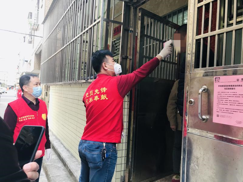 社區(qū)黨委書(shū)記黃雄光同志及班子成員、工作人員為居家隔離人員測(cè)量體溫。