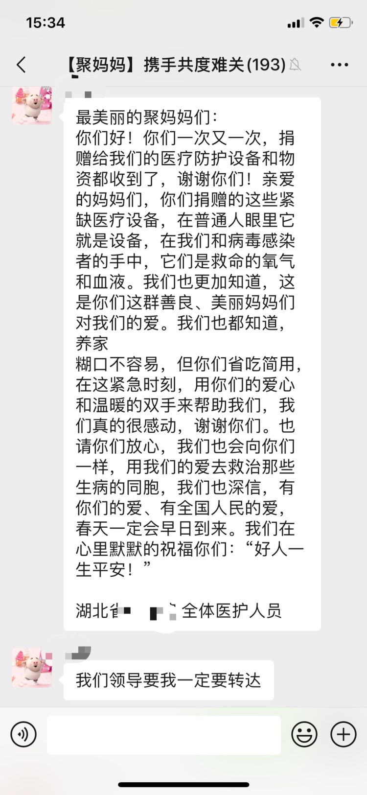 “最美麗的聚媽媽們,你們捐贈的這些緊缺醫(yī)療設備,在普通人眼里它就是設備,在我們和病毒感染者的手中,它們是救命的氧氣和血液”,武漢一家醫(yī)院的醫(yī)護人員在近日發(fā)來的感謝信中說,“請你們放心,我們也會向你們一樣,用我們的愛去救治那些生病的同胞,我們也深信,有你們的愛、有全國人民的愛,春天一定會早日到來?!保ㄓ浾哧愭?