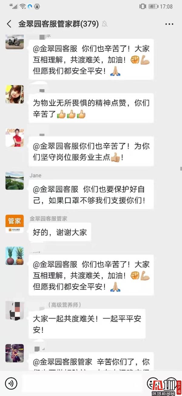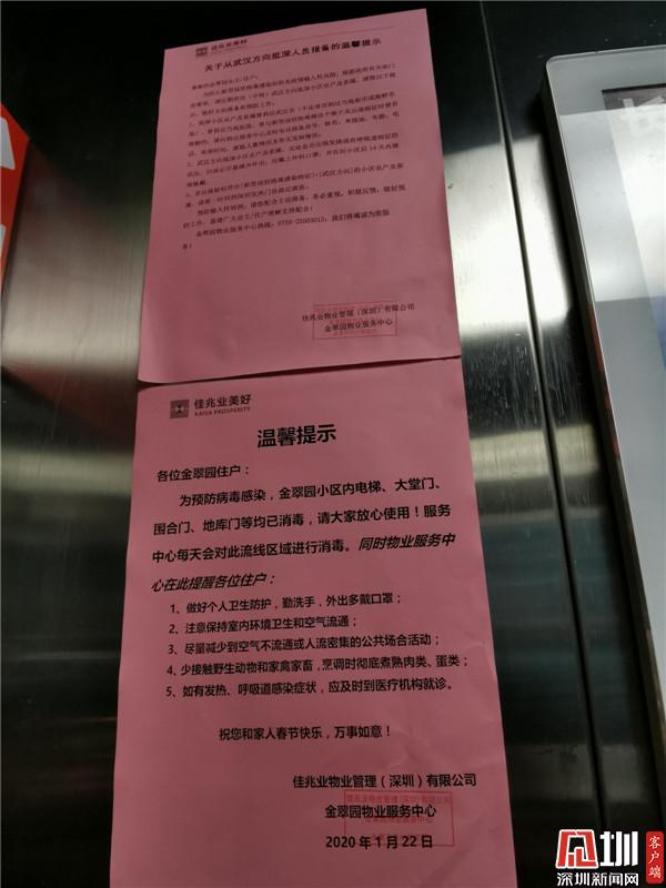 小區(qū)物業(yè)管理處主任鄒菊彬表示,目前小區(qū)每天進(jìn)行3次全面消殺,包括地面、電梯、樓道等多個(gè)位置。他表示,小區(qū)內(nèi)已張貼《新型冠狀病毒感染的肺炎相關(guān)知識(shí)和個(gè)人防護(hù)》等防護(hù)指引和宣傳資料。物業(yè)工作人員向還未返深的住戶進(jìn)行了宣傳解釋,消除恐慌。對返深的小區(qū)住戶已做好詳細(xì)信息登記,對居家醫(yī)學(xué)觀察的住戶每天兩次隨訪,并經(jīng)常給他們送一些生活用品?!拔覀兊墓ぷ魅藛T已經(jīng)把電話留給他們,有啥需要幫忙的可以隨時(shí)聯(lián)系”,他說到。