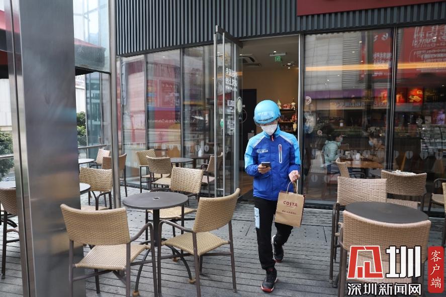 在咖啡店等待商家制作完成,取貨后,王彭輝便馬不停蹄地騎著電動車前往訂單上的地址。平日繁華的南山商區(qū),現(xiàn)在空空蕩蕩的,除了偶爾有車輛開過,路上幾乎都是外賣小哥、快遞小哥的身影,“現(xiàn)在就是大家都待在家里,路上人和車少了,我們也能更快地把訂單送達(dá)?!蓖跖磔x說:“我以前是在梅林那邊工作,剛開始來南山這邊送外賣的時候,對這里的路不熟悉,覺得每個路口都長得一樣,抬頭都是大廈,低頭都是人,但是做得久了以后,慢慢的就熟悉了。”