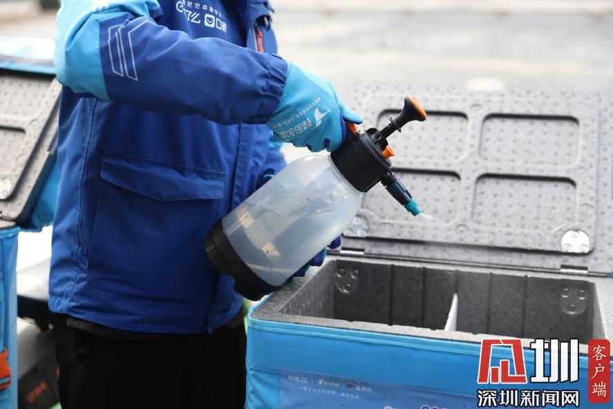外賣小哥向保溫箱內(nèi)噴灑消毒液進(jìn)行消毒。