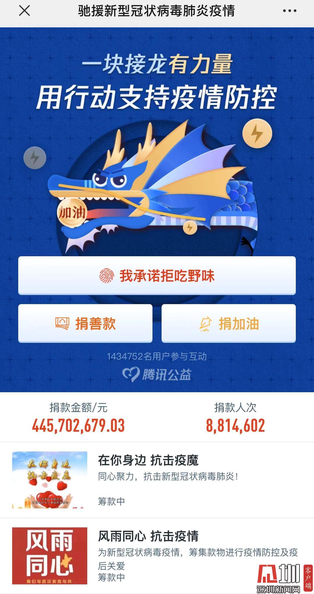此外,騰訊公益也開(kāi)通馳援新冠疫情籌集善款的專(zhuān)項(xiàng)平臺(tái),該平臺(tái)上已有53家慈善組織啟動(dòng)執(zhí)行工作。截至2月2日下午6點(diǎn)45分,該平臺(tái)籌集善款445702679.03元,累計(jì)捐款達(dá)8814602人次。目前這些啟動(dòng)執(zhí)行工作的公益組織都在按照騰訊公益平臺(tái)和運(yùn)營(yíng)規(guī)則進(jìn)行。騰訊公益平臺(tái)也將通過(guò)“透明機(jī)制“追蹤這些的項(xiàng)目的執(zhí)行情況。