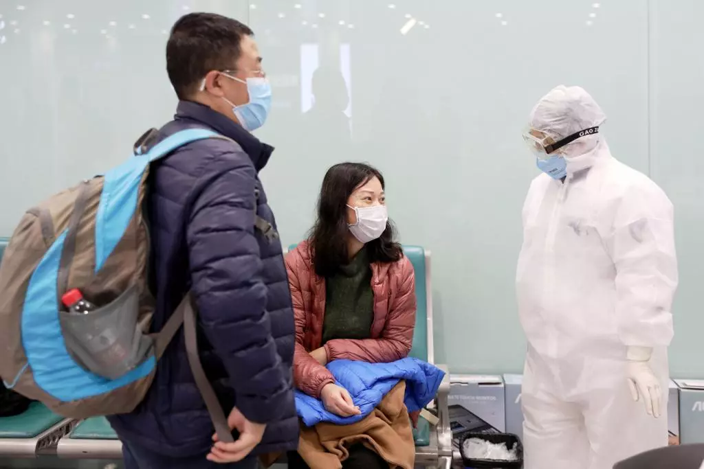 在機(jī)場(chǎng)檢疫站旁,醫(yī)務(wù)人員對(duì)旅客進(jìn)行詢問和醫(yī)學(xué)健康篩查。