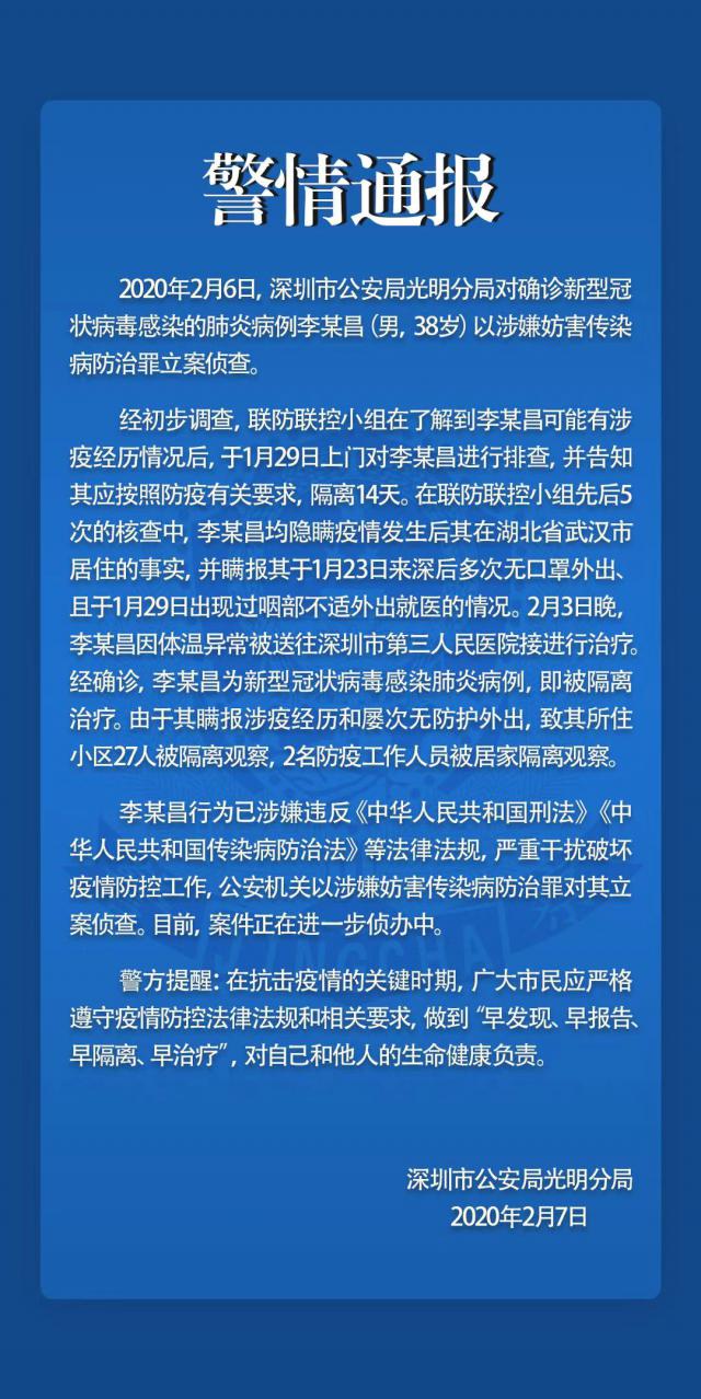 2020年2月6日,深圳市公安局光明分局對確診新型冠狀病毒感染的肺炎病例李某昌 (男,38歲 )以涉嫌妨害傳染病防治罪立案偵查。