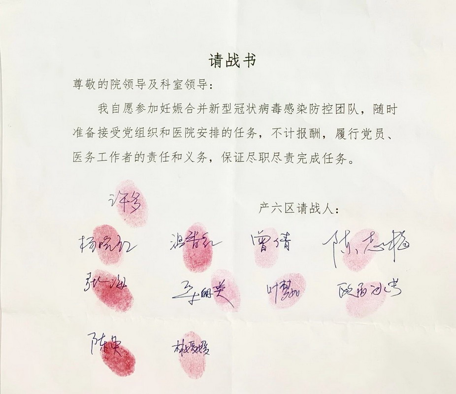 面對疫情,黨員干部紛紛向科室提交請戰(zhàn)書并莊嚴(yán)宣誓,志愿參加疫情防控的阻擊戰(zhàn)。產(chǎn)科共收到200多份請戰(zhàn)書,特別是有三名孕婦請纓,令人動(dòng)容。請戰(zhàn)人員組成了三個(gè)防控梯隊(duì),為醫(yī)院妊娠合并新型冠狀病毒感染防控奠定了強(qiáng)大的人力資源保障。