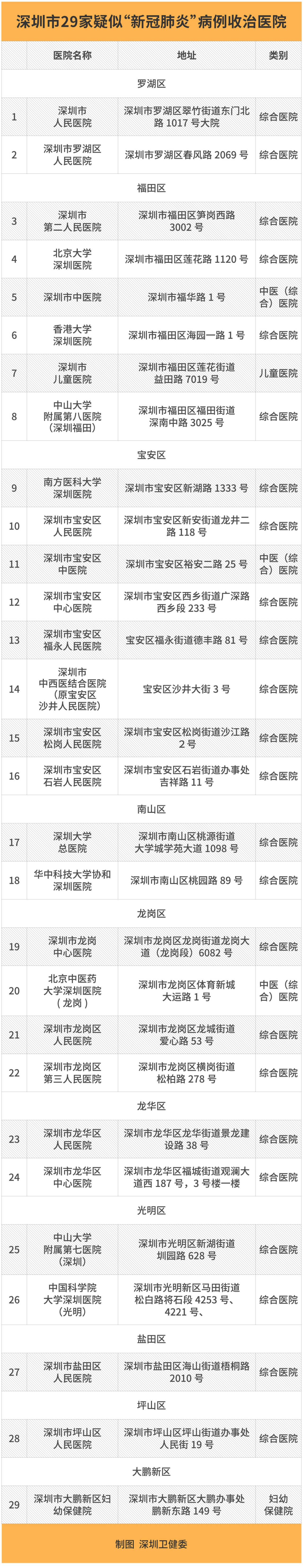 如果患者符合疑似病例條件,應(yīng)就地隔離。與此同時,醫(yī)院會立即將患者情況上報,并同步報告至所在區(qū)域收治醫(yī)院。目前,深圳已經(jīng)發(fā)布了29家疑似病例收治醫(yī)療機(jī)構(gòu)名單,市級收治醫(yī)院主要負(fù)責(zé)本院就診的疑似病例的集中收治,區(qū)級收治醫(yī)院主要負(fù)責(zé)本院就診及接收轄區(qū)區(qū)屬醫(yī)院、社會辦醫(yī)院和社區(qū)健康服務(wù)中心等基層醫(yī)療機(jī)構(gòu)轉(zhuǎn)診的疑似病例的集中排查和收治。
