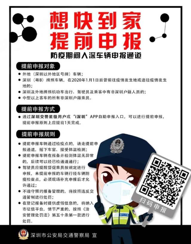 深圳交警提示,預(yù)計返深車流將逐漸增大,為了更快速的通過檢疫點,建議即將返深的車主和廣大市民提前通過網(wǎng)上進行申報。