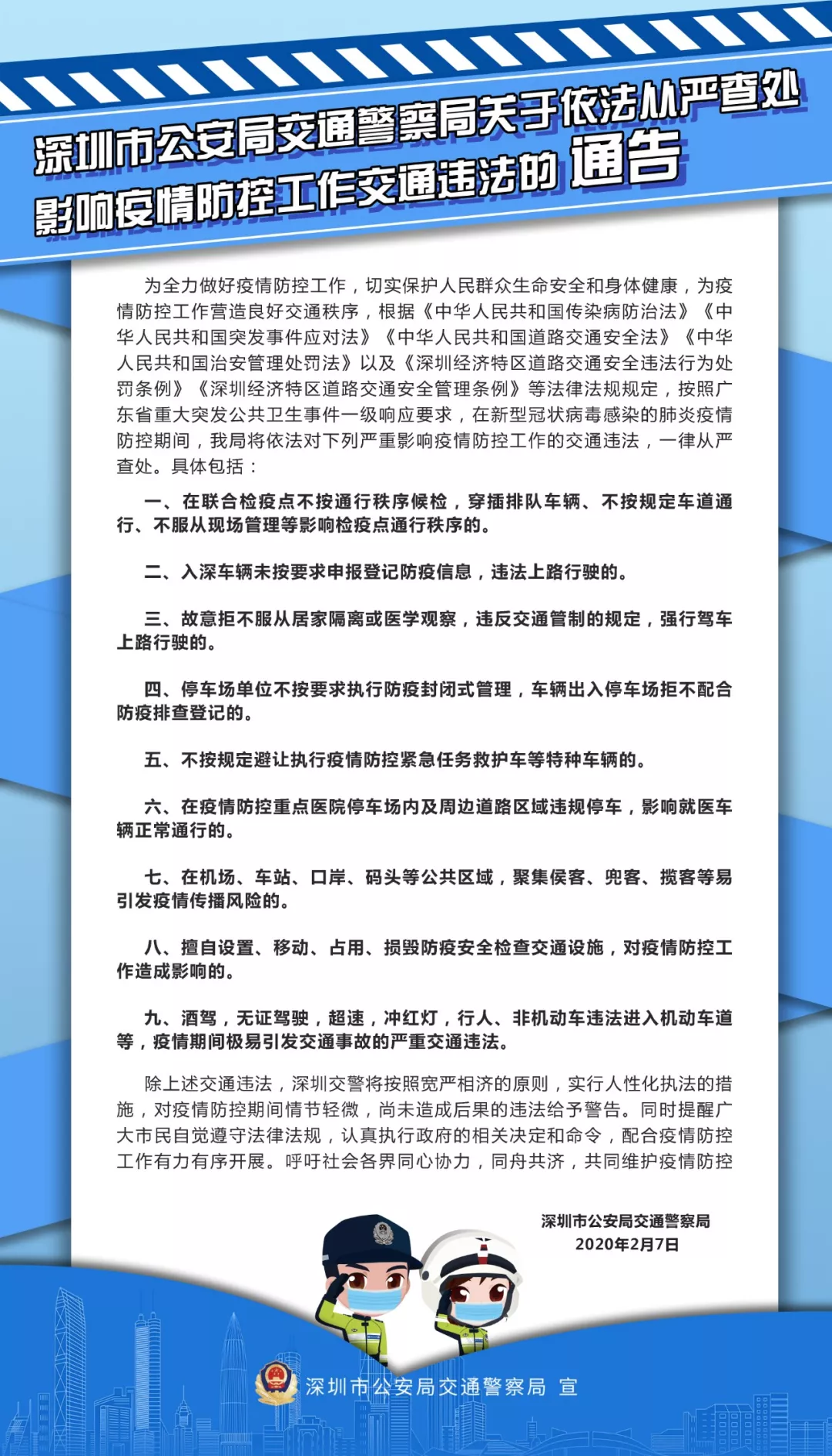 深圳市公安局交通警察局關(guān)于依法從嚴查處影響疫情防控工作交通違法的通告