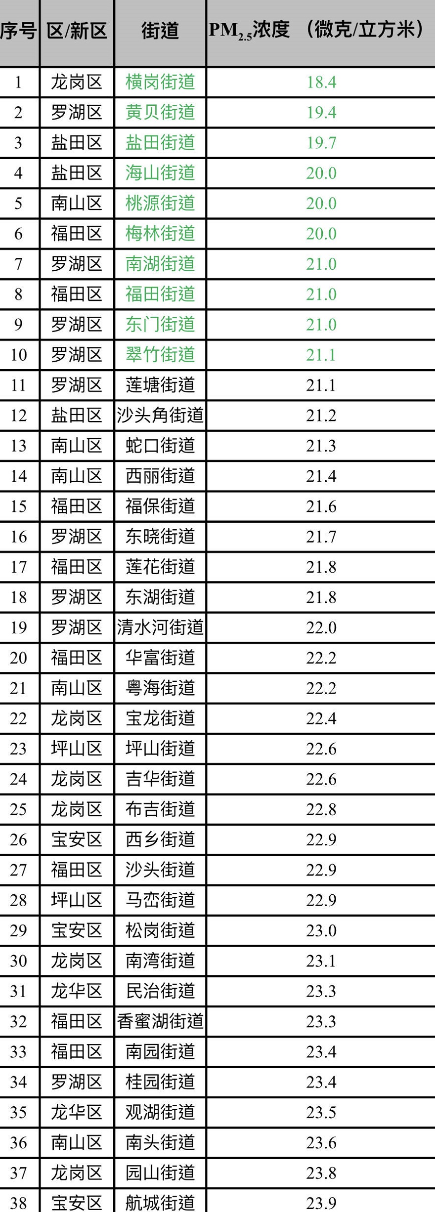 此外,各區(qū)PM2.5平均濃度在21.4-27.6微克/立方米之間,濃度較低的有鹽田、羅湖和福田,濃度較高的有光明、龍華和寶安。