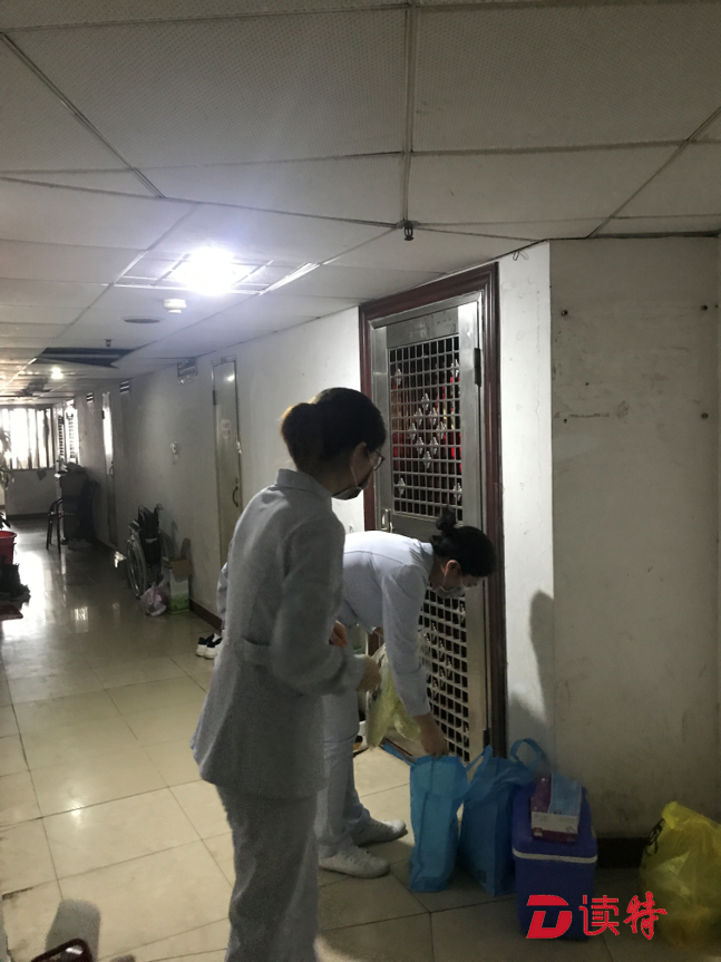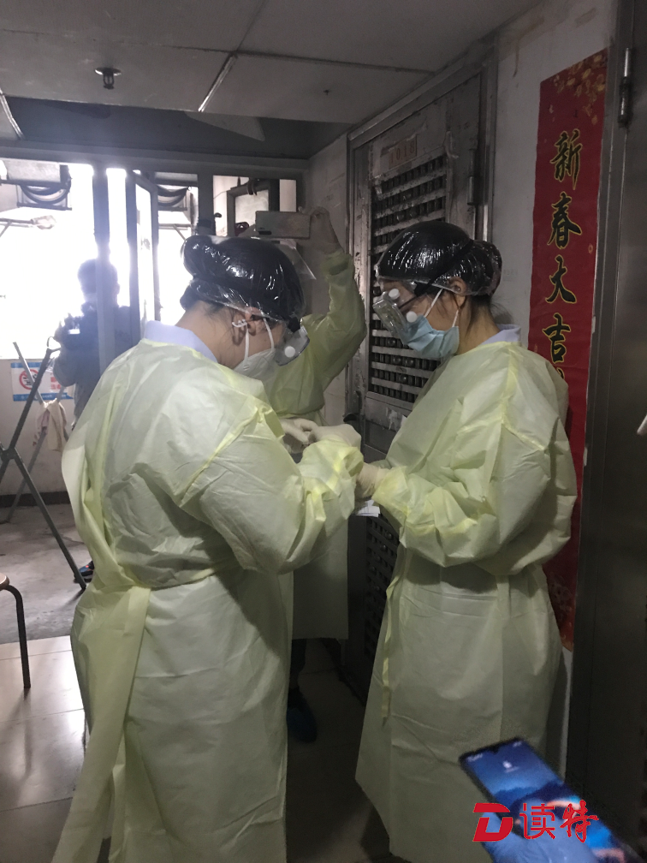 孫女士打開門,將工作人員遞進(jìn)去的防護(hù)裝備穿戴完畢?!盀榱吮Wo(hù)醫(yī)護(hù)人員的安全,減少交叉感染的可能性,所有的上門檢測都會在樓道里進(jìn)行?!鄙缈抵行墓ぷ魅藛T說。提前穿好防隔服等防護(hù)裝備、拿檢測時給居民坐的凳子、為凳子消毒,開始進(jìn)行檢測前就需要做很細(xì)致的準(zhǔn)備工作。