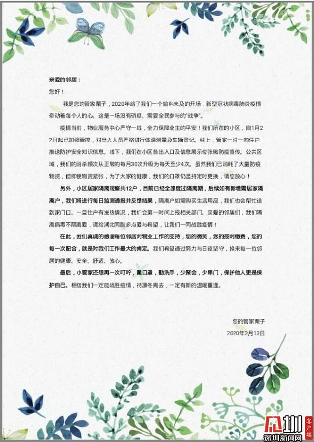 見圳客戶端·深圳新聞網(wǎng)2020年2月13日訊(見圳客戶端·深圳新聞網(wǎng)記者 潘潤(rùn)華)“他們對(duì)疫情的恐懼并不少半分,可卻堅(jiān)持在工作崗位?!薄八麄兙褪俏覀冃哪恐械哪嫘姓?。守護(hù)著我們的安全。”近日,一幕幕暖心畫面在深圳上演,不少業(yè)主紛紛踴躍為物業(yè)員工捐款,以表達(dá)對(duì)這些“平安守護(hù)者”“逆行人”的謝意。