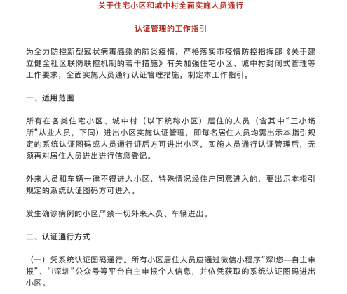2月9日,深圳發(fā)布《關(guān)于住宅小區(qū)和城中村全面實(shí)施人員通行認(rèn)證管理的工作指引》,文中明確表示所有在各類住宅小區(qū)、城中村居住的人員需通過微信小程序“深i您”、“i深圳”公眾號等平臺自主申報(bào)個(gè)人信息,并依憑獲取健康碼進(jìn)出小區(qū),無須再做登記。