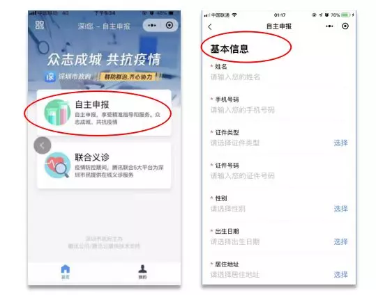 第一步:通過(guò)微信搜索“深i您-自主申報(bào)”小程序、i深圳公眾號(hào)-抗擊疫情-深i您自主申報(bào)、“i深圳”APP疫情防控服務(wù)專區(qū)入口等多途徑進(jìn)入自主申報(bào)平臺(tái),請(qǐng)根據(jù)實(shí)際情況填寫基本信息、人員類型、是否居家隔離、居住屬性、是否有如下癥狀、其他等信息,其中帶*號(hào)和有必選字樣的為必填項(xiàng),請(qǐng)按照平臺(tái)提示填寫。