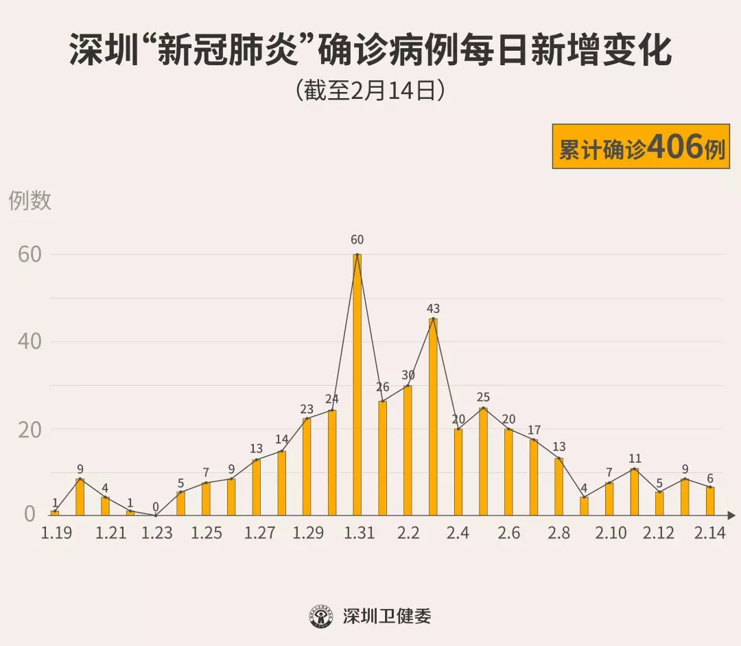 見圳客戶端·深圳新聞網(wǎng)2020年2月15日訊 截至2月14日24時,深圳累計報告“新冠肺炎”確診病例406例。2月14日當(dāng)天全市新增確診病例6例(個案詳情今晚公布)。