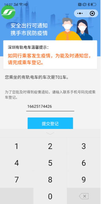 第一步:乘客使用微信掃描列車車廂內(nèi)的登記碼,登記頁面會自動顯示上次登記的手機(jī)號或在“深圳通+”小程序中注冊的手機(jī)號碼: