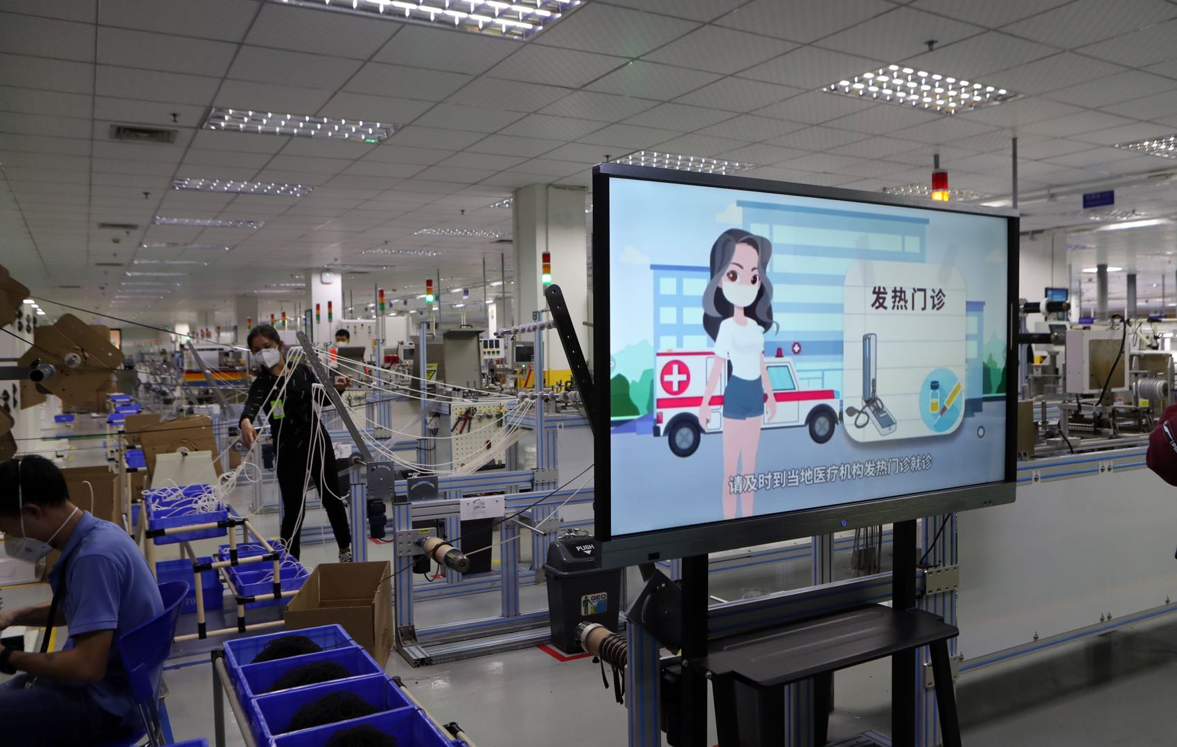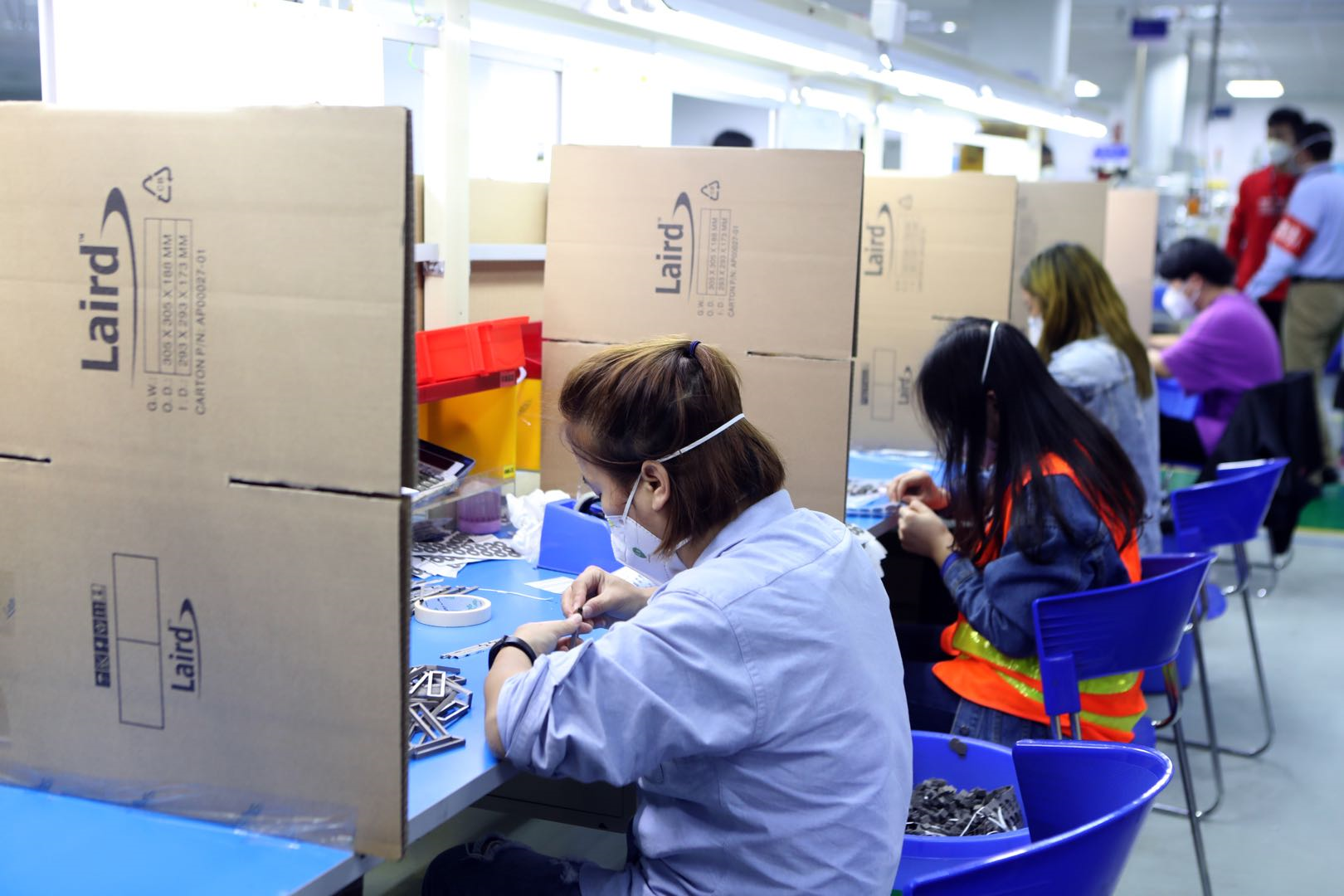 在工作車間,記者看到,每一位員工都背對背而坐,且員工之間保持著大約1.5米的距離,并被擋板完全隔開。