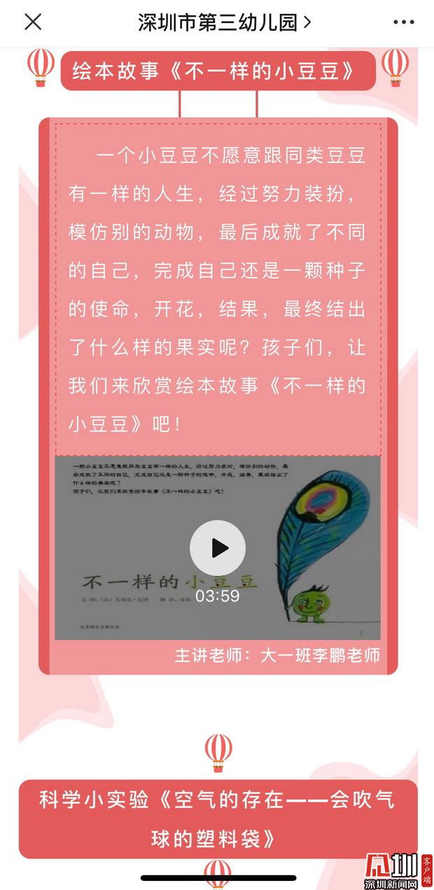 深圳市第三幼兒園園長(zhǎng)邱雪華訴記者:“目前,三幼已經(jīng)開(kāi)啟線上教學(xué)活動(dòng),我們充分運(yùn)用公眾號(hào)、微信群等網(wǎng)絡(luò)平臺(tái),與家長(zhǎng)、幼兒充分互動(dòng),陸續(xù)推出具有健康促進(jìn)特色的圖文推送,其中包括介紹防疫常識(shí)的攻略、由園長(zhǎng)主講的園長(zhǎng)電臺(tái),還創(chuàng)辦了每日一期的原創(chuàng)系列游戲,以便家長(zhǎng)在家也能獲取適宜的親子游戲活動(dòng)資源?!庇浾咴谏钲谑械谌變簣@的微信公眾平臺(tái)上看到,幼兒園線上互動(dòng)內(nèi)容豐富,其中包括視頻繪本故事、科學(xué)小實(shí)驗(yàn)以及親子體育游戲。每個(gè)版塊均由深圳市第三幼兒園老師們主講示范并錄制視頻,便于孩子及家長(zhǎng)學(xué)習(xí)。