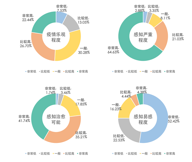 從深圳市民對(duì)疫情的感知情況來看,79.42%的受訪者對(duì)此次新冠肺炎疫情持積極態(tài)度。這種樂觀的態(tài)度尤其體現(xiàn)在深圳市民對(duì)于疾病易感程度和治愈可能的自我評(píng)估上。74.96%的受訪者表示自己感染新冠肺炎的可能性很小,認(rèn)為自己感染后能夠被治愈的人群占比更是達(dá)到了76.95%。一方面,這反映出深圳市民對(duì)于政府和醫(yī)院的疫情應(yīng)對(duì)措施的充分信任;另一方面,較低的感知易感度卻也暴露出了人們對(duì)于感染新冠肺炎可能存在僥幸心理。盡管如此,多數(shù)深圳市民還是能夠正確認(rèn)識(shí)此次疫情的嚴(yán)重性,認(rèn)為感染新冠肺炎將會(huì)對(duì)自身產(chǎn)生嚴(yán)重影響的受訪者占比達(dá)到了85.66%。