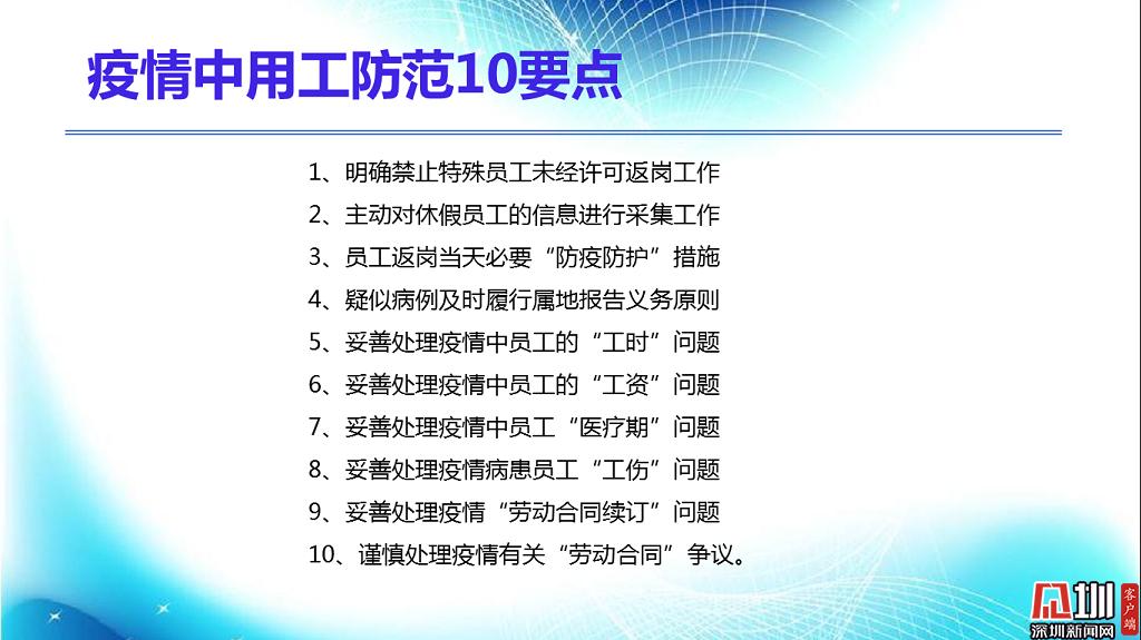 見(jiàn)圳客戶(hù)端?深圳新聞網(wǎng)2020年2月18日訊(見(jiàn)圳客戶(hù)端、深圳新聞網(wǎng)記者 焦慧茹)疫情影響了社會(huì)的方方面面,給企業(yè)和職工帶來(lái)了新的問(wèn)題。對(duì)于廣大職工而言,擔(dān)心的是疫情期間工資發(fā)放、復(fù)工安排等。對(duì)于企業(yè)而言,擔(dān)心的是如何順利復(fù)工復(fù)產(chǎn)。為此,深圳市總工會(huì)聯(lián)合深圳新聞網(wǎng)推出“復(fù)工防疫微課堂”第六期,邀請(qǐng)講師楊文浩,分析、整理了疫情之下企業(yè)復(fù)工用工防范要點(diǎn),幫助大家解決困惑。