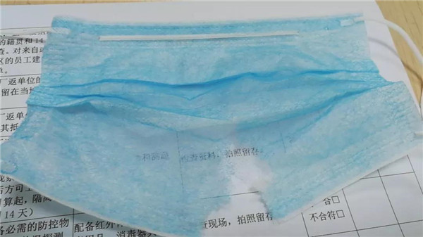 5、使用沒有鼻夾金屬條的口罩,鼻梁處無法壓緊,而且戴反了(深色為正面應(yīng)朝外)。