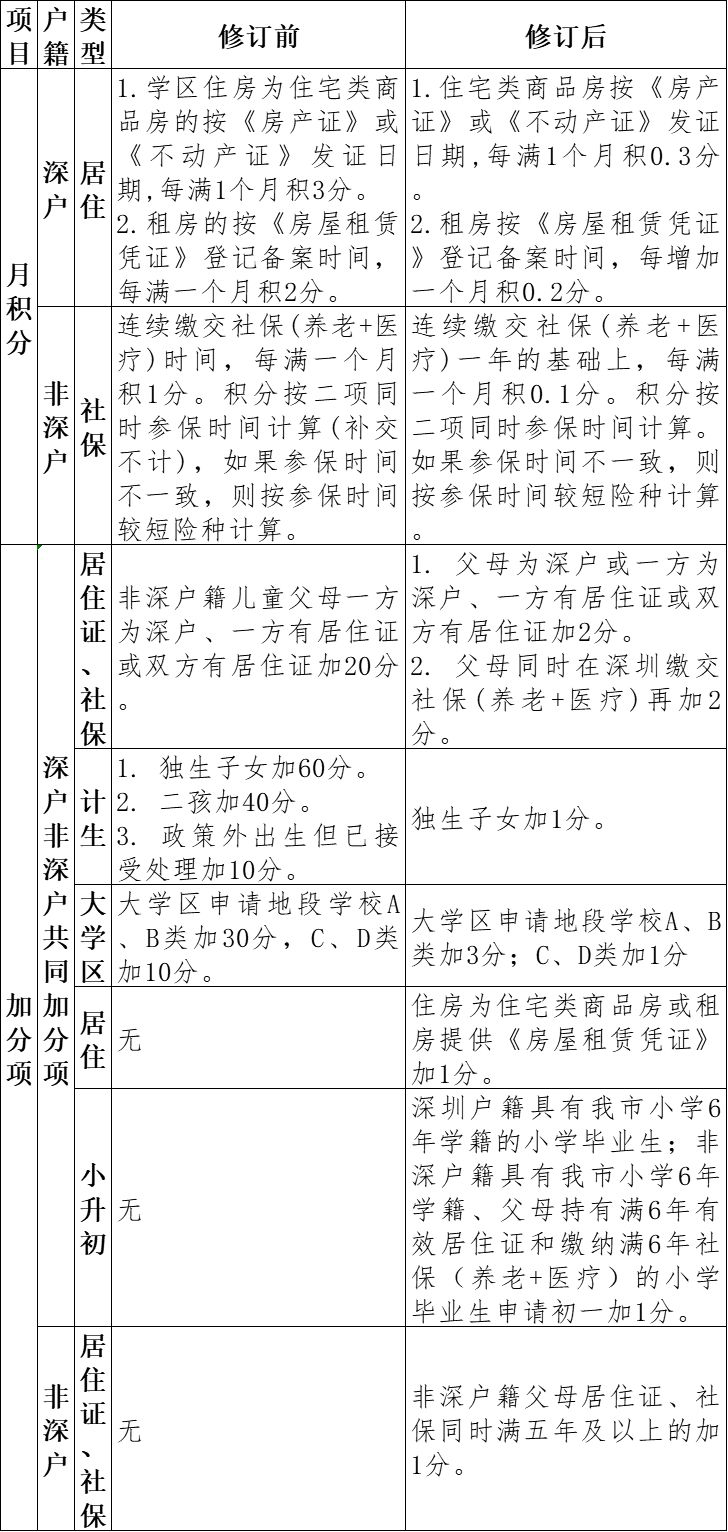 (1)深圳戶籍購房從每滿1個(gè)月積3分,調(diào)整為積0.3分;租房從每滿1個(gè)月積2分,調(diào)整為0.2分。