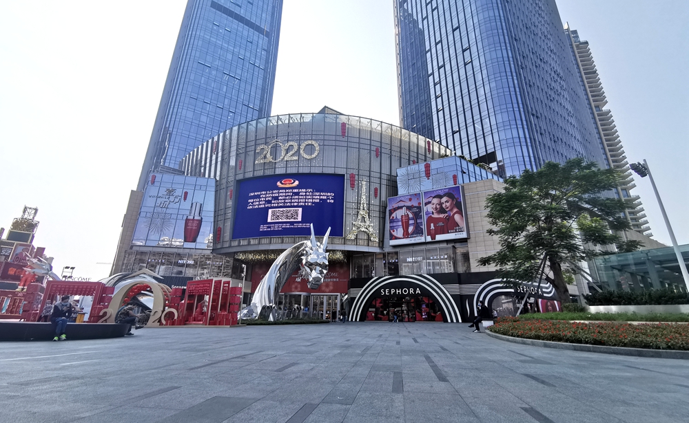 當(dāng)天上午11時,記者來到壹方城,過去熱鬧的正門廣場上如今僅有寥寥幾個行人。往大門走去,記者看到兩側(cè)的門已經(jīng)關(guān)閉,只留下中間的通道給市民進出,進口和出口分開,市民進入商場時必須掃碼實名登記,身著防護服的工作人員在入口處引導(dǎo)市民登記和測溫。