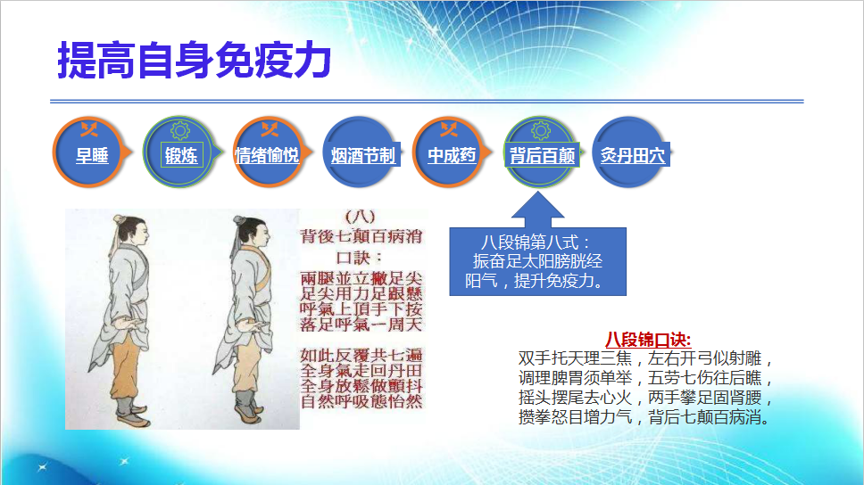 6.背后百顛:背后百顛從養(yǎng)生方法“八段錦”演化而來(lái),口訣如下:雙手托天理三焦,左右開弓似射雕,