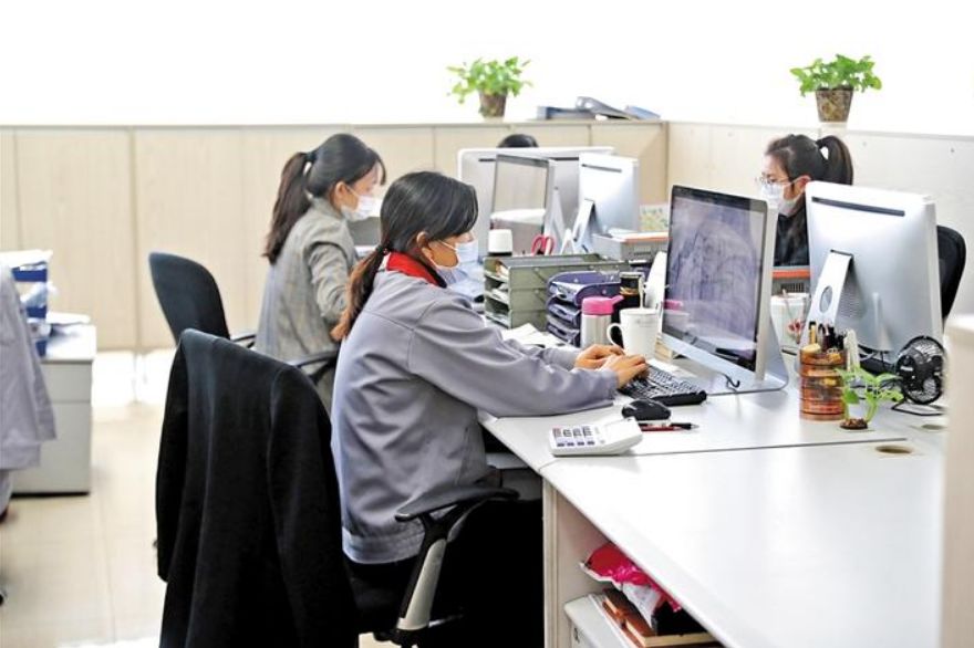 位于觀瀾街道的國橋?qū)崢I(yè)(深圳)有限公司,員工帶著口罩有序辦公。