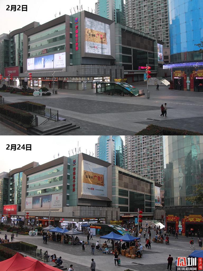 上圖為2月2日,人跡罕見的華強北電子商業(yè)街,下圖為2月24日,華強北電子商業(yè)街人流量已有明顯增多。